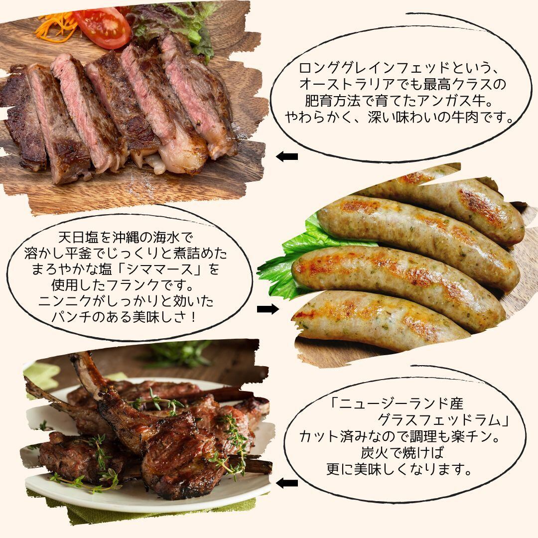 贅沢なお肉を堪能できる「アンガス牛リブロースステーキ」「ラムチョップ」「シママースガーリックフランク」のセットです。